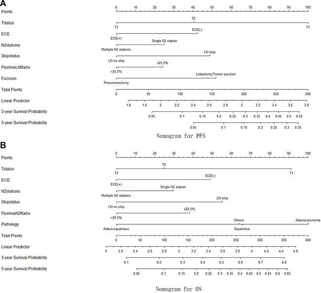 Figure 2: (A) The nomogram for PFS, constructed based on T stage, ECE, posivive N2 station number, LN skip status, positive LN ratio and the surgical procedures; (B) the nomogram for OS, constructed based on T stage, ECE, posivive N2 station number, LN skip status, positive N2 ratio and pathology.