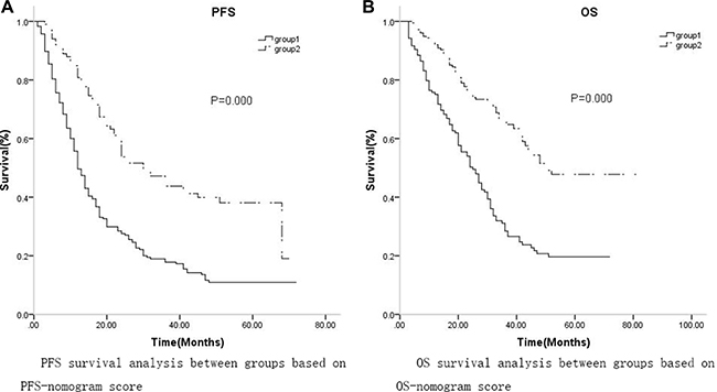 Figure 4: (A) The median PFS and 3-year PFS probability were lower in group 1 (12 months, 95% CI: 10.475–13.525, 17.8%, respectively) than in group 2 (30 months, 95% CI: 21.931–38.069, 43.8%, respectively, p = 0.000); (B)The median OS and 3-year OS probability were also lower in group 1 (25 months, 95% CI: 20.352–29.648, 28.4%, respectively) than in group 2 (51 months, 95% CI: 45.615–59.382, 65.5%, respectively, p = 0.000).