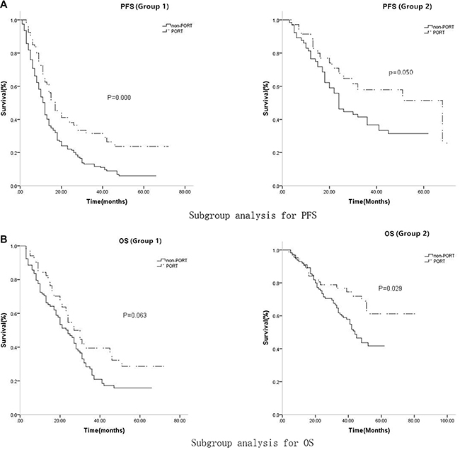 Figure 5: For PFS, In low-score group, the median PFS and 3-year PFS probability were 12 months (95%CI: 10.462-13.538) and 11.7% for non-PORT subgroup, while 17 months (95%CI: 13.340–20.660) and 31.5% for PORT subgroup respectively, (p = 0.000). In high-score group, the median PFS and 3-year PFS probability were 24 months(95% CI: 19.558–28.412) and 36.7% for non-PORT subgroup, while 46 months (95% CI: 26.660–58.962) and 57.9% for PORT subgroup respectively, (p = 0.050); for OS, In low-score group, the median OS and 3-year OS probability were 24 months (95% CI: 18.830–29.170) and 23.4% for non-PORT subgroup, while 27 months (95% CI: 21.017–32.983) and 35.8% for PORT subgroup respectively, (p = 0.063); In high-score group, the median OS and 3-year OS probability were 44 months (95%CI: 37.909–50.091) and 59.9%% for non-PORT subgroup, while 56 months (95% CI: 50.134–64.962) and 76.8% for PORT subgroup respectively, (p = 0.029).