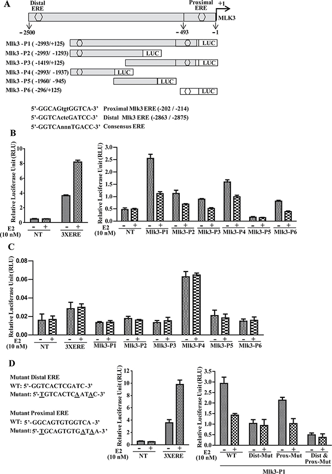 To validate a potential transcriptional regulation of MLK3 by E2-ER axis, next we asked whether MLK3 promoter was regulated by ER via direct binding to ERE (Estrogen Receptor Element). We analyzed approximately 3 kb upstream sequence between first ATG (where A is designated as +1) and adjacent gene PCNXL3 located on the chromosome 11 (q13.1-q13.3), using MatInspector software from the Genomatix (version 3.2) [16]. The promoter sequence was submitted to the GenBank (accession no. KP144995). Two putative EREs were identified with significantly high matrix score located at –2863/–2875 bp and –202/–214 bp. These EREs were designated as distal- (–2863/–2875) and proximal- (–202/–214) EREs respectively. A core promoter of 60 bp was predicted using Eukaryotic Promoter Database (http://epd.vital-it.ch/) from the Swiss Institute of Bioinformatics, located –483 to –542 bp that also contains putative RNA pol II binding motif (–499/–505 bp) upstream to the transcription start site. Among all predicted transcription factor binding motifs in the MLK3 promoter, we focused our efforts on the characterization of the two putative EREs that contain 13 bp imperfect palindrome separated by 3 bp (DR3-like). The nucleotide sequences and positions of these putative EREs are as follows: proximal-ERE: 5′-GGTCActcGATCC-3′ (–202/–214) and distal-ERE: 5′-GGCAGtgtGGTCA-3′ (–2863/–2875) (Figure 3A). The sequence of distal-ERE resembles more closely to the consensus ERE that is present in most of the ER–responsive genes (Figure 3A) [17].