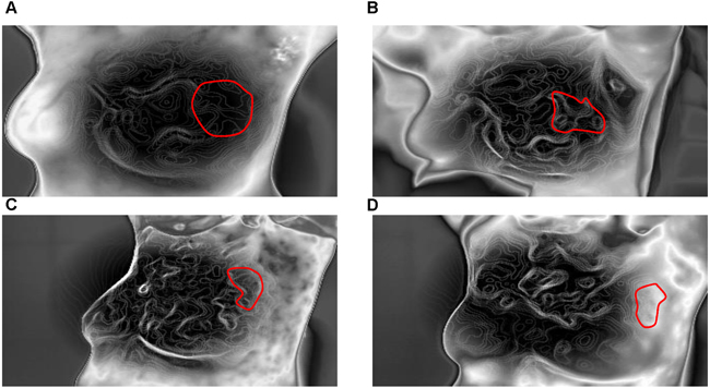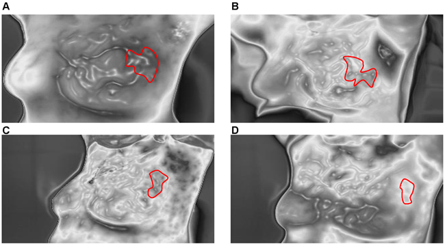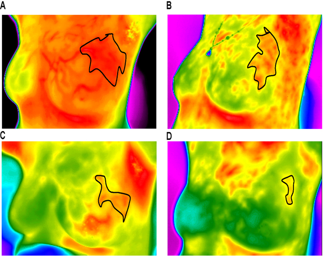 Figure 1: Thermal tomography images of a typical response before and after NAC. A.-D. show a significant decrease in surface temperature in the area of the tumor before and after one, three, and six cycles of NAC (these measurements can vary from black (coolest) to white (warmest), with 14 “intermediate” colors).