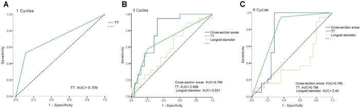 The ROC curves shown in Figure 5 indicate the accuracy of prediction for different trade-offs based on TT, REC and SM values, which were normalized to baseline values. After considering all parameters, specialists assessed and divided the cohort into responding and nonresponding groups based on TT. ROC curves showed that TT and the normalized SM had comparable predictive values and were more accurate than REC. Based on the AUC, the predictive power for TT was similar for all time points, with AUC values of 0.841, 0.689, and 0.794 after one, three, and six cycles, respectively. The SM AUC was 0.789 after three cycles and 0.768 after six cycles. However, the REC AUC was 0.581 after three cycles and only 0.40 after six cycles.