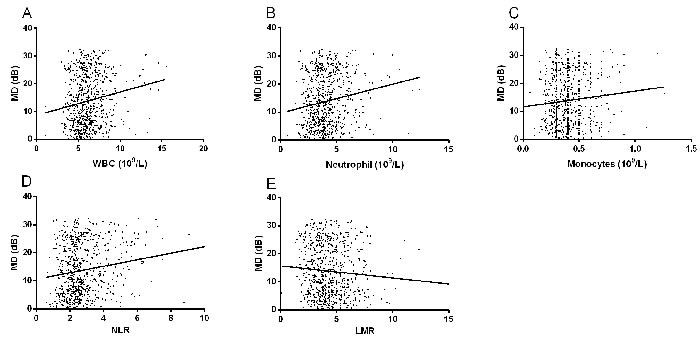 Abbreviations: VCDR: vertical cup-disc ratio. MD: visual fields mean deviation. WBC: white blood cell. NLR: neutrophil-to-lymphocyte ratio. LMR: lymphocyte-to- monocyte ratio. Adjusted for age, gender, intraocular pressure, central corneal thickness, axial length, and anterior chamber depth.