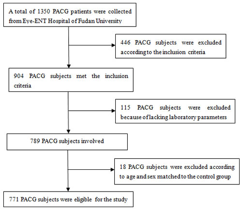 A retrospective review of 771 patients with newly and referral diagnosed PACG, was carried out between January 2010 to December 2015 from Eye-ENT Hospital of Fudan University. 770 age-matched and sex-matched normal controls were consecutively recruited from subjects who participated in yearly health screenings during the study period. The research was approved by the Ethics Committee of the Eye-ENT Hospital of Fudan University, Shanghai, China and was conducted according to the Declaration of Helsinki. Inform consent was obtained for all patients at the time of admission to the Eye-ENT Hospital of Fudan University. The study cohort flow diagram is shown in Figure 5. Each PACG patients underwent a standardized ophthalmic examination, which included refractive status, slit-lamp biomicroscopy, fundus examination, IOP (intraocular pressure), CCT (central corneal thickness), AL (axial length), ACD (anterior chamber depth), visual field examination, and gonioscopy, performed by glaucoma specialists. MD and MS were measured with the Octopus automated perimetry (HAAG, STREIT, Switzerland). IOP was measured using Goldmann applanation tonometry. Fundus photography was performed with a retinal camera (TRC-NW200, Topcon). A-scan ultrasound (A-Scan Pachymeter, Ultrasonic, Exton, PA, USA) was used to measure AL, ACD, and CCT. Moreover, medical examinations were performed by respective physicians for all subjects at the Eye-ENT Hospital of Fudan University. Clinical and demographic information were obtained from the medical data platform of Eye-ENT Hospital of Fudan University by trained staff (SJ Li and BH Tang) using standardized data collection and quality-control procedures, resulting in reliable data for analysis. This database was used previously to study patients with glaucoma [34].