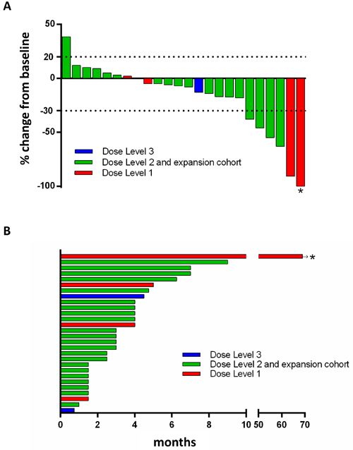 The clinical activity results are summarized in Table 1B and are shown in Figures 1A and 1B. 27 patients were evaluable for response determination. Four patients discontinued treatment during cycle 1 or 2, due to drug toxicity (1, not evaluable for response), disease progression with development of brain metastases (2 patients) or of new chest wall lesions (1 patient). The latter three were counted as disease progression. One patient on the dose escalation cohort achieved a durable complete response (CR; 69+ months), 5 had partial response (PR; median 4 months, range 4-7 months) for an objective RR (ORR) of 22% (6/27). Seven patients had stable disease (SD; median 5.5 months, range 4-9 months) yielding a disease control rate of 48% (13/27). Three patients received a carboplatin regimen prior to study entry. The patient with a 24-month carboplatin-free window achieved SD for 9 months. The two patients who had a prior carboplatin regimen, had disease progression at first imaging reassessment.