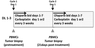 This open label 3+3 dose escalation study examined the combination of olaparib 400mg capsules every 12 hours on days 1-7 with carboplatin AUC3, 4, or 5 on day 1 or 2 (dose levels 1-3), in every 21-day cycles (Figure 3). Carboplatin scheduling was adjusted to accommodate patient travel or when a progressive carboplatin concentration infusion program was required to obviate allergic reactions. No more than 8 cycles of combined therapy was given after which continuous daily olaparib monotherapy at a maintenance dose of 400mg capsules every 12 hours was given. DLTs (CTCAEv3.0) were defined as grade 3 or 4 nonhematologic and grade 4 hematologic adverse events related to study medications occurring during the first two cycles of therapy. The following were exceptions: grade 3 diarrhea, nausea, or vomiting must have been unresponsive to optimal medical management, and asymptomatic grade 3 reductions in electrolytes rapidly reversed with medical management. Grade 3 thrombocytopenia lasting for ≥ 7 days or requiring transfusion, and grade 4 neutropenia for ≥ 7 days or with fever, were dose-limiting. Complete blood counts and serum chemistries were monitored weekly during the DLT period.