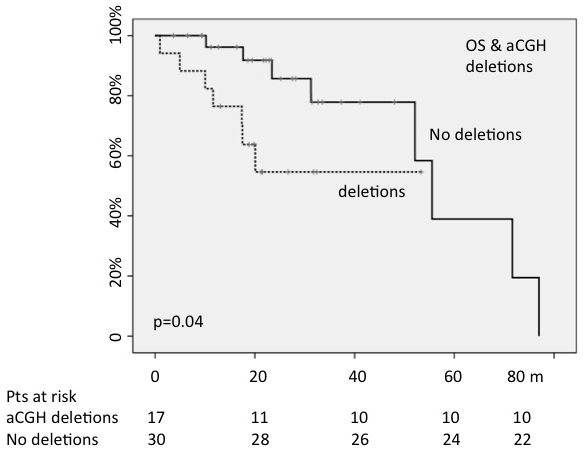 The presence/absence of whatever abnormality found by aCGH did not change OS; on the contrary, 30-months OS was 57% for patients showing a deletion shown by aCGH versus 83% of not deleted patients (p = 0.04) (Figure 2).