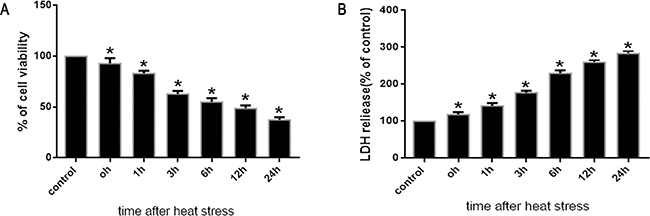 Figure 1: Effects of heat stress on cell viabilityand cytotoxicity in SW480 cells. SW480 cells underwent intense heat stress (43°C) for 2h, and were further incubated at 37°C for different times as indicated (0h, 1h, 3h, 6h, 12h or 24h). The percentages of viable cells and dead cellswere assessed by WST-1 A. and LDH release B. assays. Percent viability is expressed relative to control cells cultured at 37°C. The data shown represent the mean ±SD of at least three independent experiments, performed in duplicate. *P < 0.05, statistically significant relative to control (37°C).