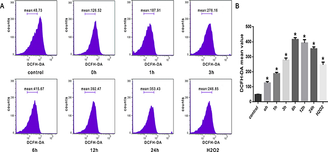 Figure 2: ROS increased after heat stress in SW480 cells. SW480 cells underwent intense heat stress (43°C) for 2h, and were further incubated at 37°C for different times as indicated (0h, 1h, 3h, 6h, 12h or 24h). Cells were labeled with 10 μM DCFH-DA for detection of ROS. H2O2 was used as a positive control. A. Flow cytometry analysis of heat stress-induced ROS. B. The histogram represents quantified ROS generation after heat stress analyzed by flow cytometry. The data shown represent the mean ±SD of at least three independent experiments, performed in duplicate. *P < 0.05, statistically significant relative to control (37°C).