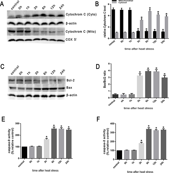 Cytochrome C interacts with apoptotic protease-activating factor-1(Apaf-1) in the cytosol resulting in the downstream recruitment, procession, and activation of pro-caspase-9 in the presence of dATP or ATP [8]. Caspase-9 cleaves and activates pro-caspase-3 and pro-caspase-7, and serves as an activating protein in the mitochondrial apoptosis pathway [7-9]. As shown in Figure 6E and 6F, caspase-9 activity significantly increased at 3h and peaked at 6h after heat stress. Caspase-3 expression was closely correlated with increased expression of caspase-9 activity.