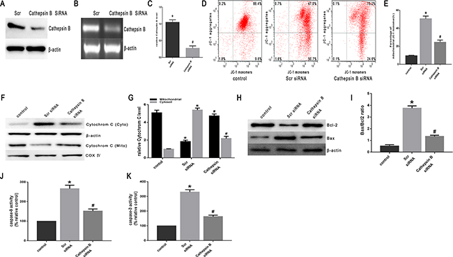 Figure 7: Heat stress activates apoptosis in cathepsin B siRNA-transfectant SW480 Cells. SW480 cells were transfected with scrambled siRNA(Scr)or cathepsin BsiRNA (cathepsin B). A. Western blots of cathepsin B protein expressed in SW480 transfectant cells. β-actin was run as an internal control. B. RT-PCR analysis of cathepsin B in SW480 transfectant cells. Total RNA was isolated from SW480 transfectant cells. Cathepsin B mRNA levels were determined by RT-PCR and analyzed on agarose gel electrophoresis. β-actin from the same samples was amplified as control. C. Quantification of RT-PCR for cathepsin B after heat stress. (D-K) SW480 transfectant cells were treated with 43°C for 2h and then further incubated at 37°C for 6h; D. Flow cytometry analysis heat stress-induced mitochondrial depolarization (low ΔΨm). E. The histogram represents the quantification of the percentage of low ΔΨm analyzed by flow cytometry. F. Intracellular location of cytochrome C was determined by Western blots. β-actin was run as an internal control. COX IV was used as a mitochondrial loading control. G. Quantification of Western blots for cytochrome C after heat stress. H. Bcl-2 and Bax were determined by Western blots. β-actin was run as an internal control. I. Quantification of Western blots for Bax/Bcl-2 ratio after heat stress. G. Enzymatic activity of caspase-9 was measured in cell lysates using afluorogenic substrate, Ac-LEHD-AFC. K. Enzymatic activity of caspase-3 was measured in cell lysates using a fluorogenic substrate, Ac-DEVD-AMC. The data shown represent the mean ±SD of at least three independent experiments, performed in triplicate. *P < 0.05, statistically significant relative to control (37°C), #P < 0.05, statistically significant relative to scrambled siRNA-transfected cells exposed to heat stress.