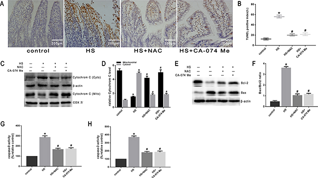 Figure 11: Effect of antioxidant NAC and cathepsin B inhibitor CA-074 Me in mitochondrial apoptosis pathway in vivo. BALB/c mice were pretreated with or without100mg/kg N-acetyl-L-cysteine (NAC, intraperitoneal) at 1h or 10mg/kg 50μM CA-074 Me (intraperitoneal) at 30min followed by exposure in a temperature controlled chamber (ambient temperature 35.5±0.5°C and 60±5% relative humidity)until the rectal core temperature (Tc)reached 42°C. A. TUNEL staining of the ileum of mice (magnification, ×200). B. Quantification of TUNEL-positive index. C. Cytochrome C was determined by Western blots. β-actin was run as an internal control. COX IV was used as a mitochondrial loading control. D. Quantification of Western blots for cytochrome C. E. Bcl-2 and Bax were determined by Western blots. β-actin was run as an internal control. F. Quantification of Western blots for Bax/Bcl-2 ratio. G. Enzymatic activity of caspase-9 was measured in cell lysates using a fluorogenic substrate, Ac-LEHD-AFC. H. Enzymatic activity of caspase-3 was measured in cell lysates using a fluorogenic substrate, Ac-DEVD-AMC. *P < 0.05, statistically significant relative to control (37°C),#P < 0.05, statistically significant relative to heat stress group (HS),(n=6/group).