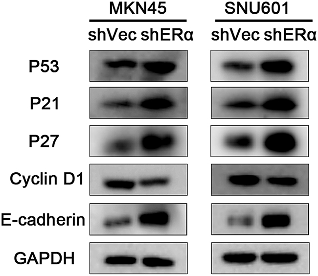 To further explore the mechanisms in the decreased proliferation, migration and invasion by ERα knockdown, proliferation associated molecules (p53, p21, p27, cyclin D1) as well as the important molecular in adherens junctions of epithelial cells (E-cadherin) were examined by western blot (Figure 6). The expression of p53, p21, p27 were increased in ERα silenced MKN45 and SNU601 cells, as opposed to cyclin D1, which could explain the suppressed proliferation of ERα knockdown GC cells. In addition, increased expression of E-cadherin was observed in ERα silenced MKN45 and SNU601 cells, which was in accordance with the inhibited migration and invasion of ERα silenced MKN45 and SNU601 cells. These results suggested that downregulation of ERα suppressed the proliferation, migratory and invasive abilities of GC cells probably by enhancing the protein levels of p53, p21, p27 and E-cadherin and inhibiting cyclin D1 expression.