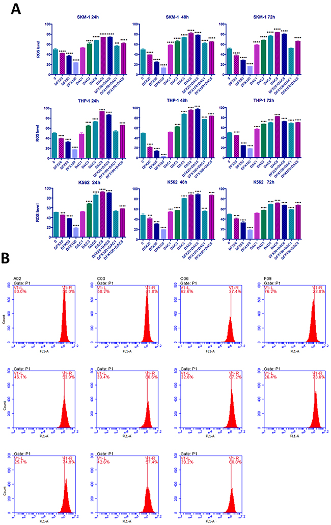 Figure 5: Level of ROS generation in leukemia cells. (A) SKM-1, THP-1, and K562 cells were treated with DFX and/or DAC at different concentrations after ROS detection and then examined using flow cytometry. (B) SKM-1 cells treated with DFX and/or DAC at different concentrations for 72 h. ROS levels were observed to be significantly decreased with increasing DFX levels and in contrast, ROS levels increased with increasing DAC levels. The effect on ROS levels in the combination group is similar to the effect on ROS levels in the DAC group.