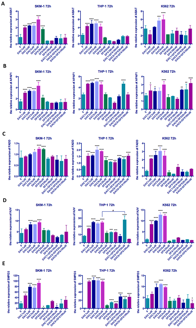 Figure 6: The relative expression of five genes in three leukemia cell lines following treatment at different concentrations of both drugs either alone or in combination. SKM-1, THP-1, and K562 cells were treated with the indicated concentrations of DFX and/or DAC for 72 h and the expression levels of genes determined by qRT-PCR (A) ABAT, (B) APAF1, (C) FADD, (D) HJV, (E) SMPD. Significantly different versus control (*, P < 0.05; **, P < 0.01; ***, P < 0.001;****, P<0.0001). Significantly different between groups (#, P<0.05; ##, P<0.01; ###, P < 0.001; ####, P<0.0001).