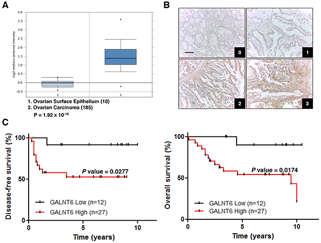 Figure 1: Relationships between GALNT6 expression and clinical features in ovarian carcinomas. (A) Oncomine database (Bonome Ovarian) shows that GALNT6 is up-regulated in ovarian carcinoma (n=185) compared with normal ovarian epithelium (n=10). Fold change 2.851, p < 0.001. (B) Representative immunohistochemical staining of GALNT6 in clear cell ovarian cancer (0, +1, +2, +3). Scale bar=50 μm. Negative control in clear cell ovarian cancer does not show any specific signals (data not shown). (C) Correlation between GALNT6 expression and disease-free survival (left panel) and overall survival (right panel) in patients with endometrioid (n=20) and clear cell (n=19) ovarian carcinoma.