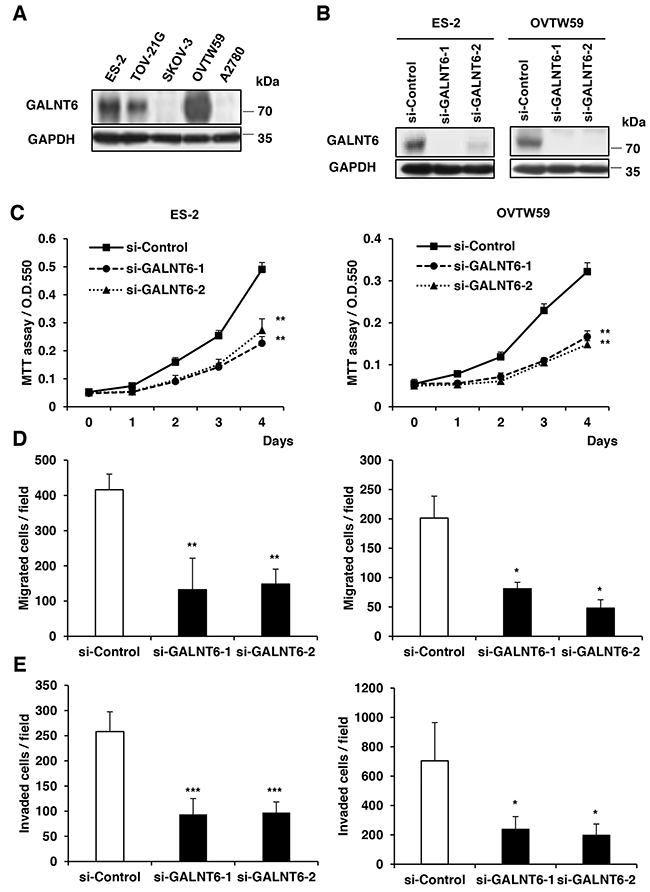 Figure 2: Effects of GALNT6 knockdown on malignant phenotypes in ovarian cancer cells. (A) GALNT6 expression in ovarian cancer cell lines. GALNT6 was differentially expressed in ES-2, TOV21G, SKOV3, OVTW59, and A2780 by Western blotting. (B) Transfection of siRNAs targeting GALNT6 (si-GALNT6-1 and si-GALNT6-2) or control siRNA (si-Control) in ES-2 and OVTW59 cells. The efficiency of GALNT6 knockdown was confirmed by Western blotting. (C) Cell viability was analyzed by MTT assay at different time points (Left, ES-2 cells; right, OVTW59 cells). (D) Effects of GALNT6 on cell migration in transwell migration assays (Left, ES-2 cells; right, OVTW59 cells). (E) Effects of GALNT6 on cell invasion in matrigel invasion assays (Left, ES-2 cells; right, OVTW59 cells). Data are presented as mean ± SD from 3 independent experiments. (*p < 0.05; **p < 0.005; ***p < 0.001).