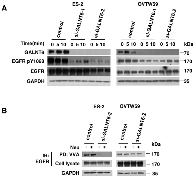 Figure 4: GALNT6 regulate EGFR activation via modulating O-glycosylation of EGFR. (A) GALNT6 knockdown decreased EGFR phosphorylation in ES-2 and OVTW59 cells. Control and GALNT6-knockdown cells were treated with 10% FBS for 10 minutes, and lysates were analyzed by Western blotting. (B) Some ES-2 and OVTW59 lysates were treated with neuraminidase (Neu) to unmask the effects of sialyation, and all were then incubated with VVA-conjugated agarose beads. Proteins pulled down by VVA were analyzed by immunoblotting (IB) with anti-EGFR antibody. Knockdown of GALNT6 decreased VVA binding to EGFR in ES-2 and OVTW59 cells. Total lysate was used as loading control.