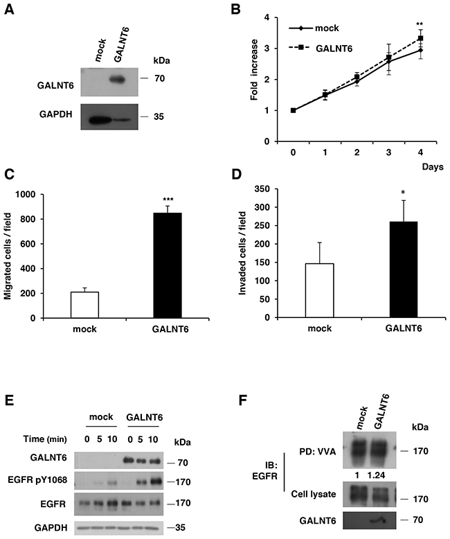 Figure 5: Overexpression of GALNT6 enhances malignant behaviors of SKOV3 cells. (A) The efficiency of GALNT6 overexpression was confirmed by Western blotting. (B) Cell viability was analyzed by MTT assay at different time points. (C) Effects of GALNT6 on cell migration in transwell migration assays. (D) Effects of GALNT6 on cell invasion in Matrigel invasion assays. (E) GALNT6 overexpression enhanced phosphorylation of EGFR. Mock and GALNT6-overexpressed SKOV3 cells were treated with 10% FBS for 10 minutes, and lysates were analyzed by Western blotting. (F) Overexpression of GALNT6 increased VVA binding to EGFR in SKOV3 cells. Expressed as integrated intensity normalized to cell lysate (middle panel) quantified by UN-SCAN-IT gel 6.1 software. Data are presented as mean ± SD from 3 independent experiments. (**p < 0.005; ***p < 0.001).