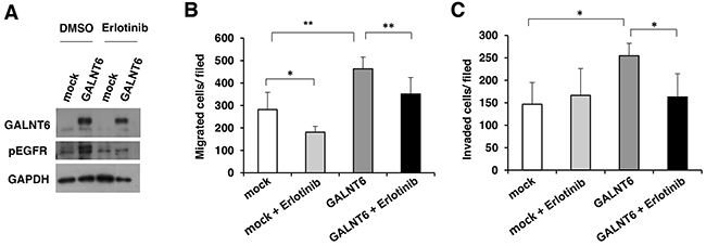 Figure 6: GALNT6-enhanced behaviors are inhibited by EGFR inhibitor. (A) GALNT6-increased phosphorylation of EGFR was inhibited by erlotinib in SKOV3 cells. (B) Transwell migration assays were performed to analyze effects of 5 μM erlotinib on cell migration in mock and GALNT6-overexpressed SKOV3 cells (mock + Erlotinib versus GALNT6 + Erlotinib, p=0.09). (C) Matrigel invasion assays were performed to analyze effects of erlotinib on cell invasion in mock and GALNT6-overexpressed SKOV3 cells (mock + Erlotinib versus GALNT6 + Erlotinib, p=0.44). Data are presented as mean ± SD from 3 independent experiments. (*p < 0.05; **p < 0.005).