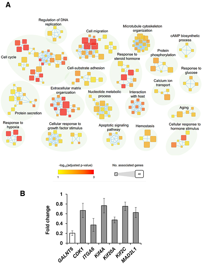 Figure 7: GALNT6 knockdown affects gene expression in ES-2 cells. (A) Enrichment results of GALNT6 knockdown in ES-2 cells were mapped as networks. Nodes represent enriched gene sets (p < 0.05), and edges represent gene overlap scores between nodes above the threshold (0.5). Node color encodes the enriched significance and node size is proportional to the number of genes which were associated with a given Gene Ontology term. Groups of functionally related Gene Ontology terms are manually identified and labelled with the appropriate terms. Groups with less than four terms are not shown in this map. (B) Quantitative RT-PCR was performed to validate microarray results. Altered expression (fold change) of selected genes upon GALNT6 knockdown in ES-2 cells compared with control. Values less than 1 represent gene downregulation. Results were analyzed from three independent GALNT6 knockdown ES-2 cell groups and their corresponding controls and are presented as mean ± SD.