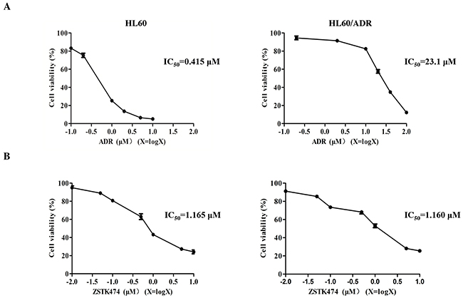 Figure 1: Antiproliferative activity of ZSTK474 in HL60 and HL60/ADR cells. (A) HL60/ADR cells showed resistance to ADR. Cell viability was determined via MTT assay after treatment with various concentrations of ADR for 48 h. (B) ZSTK474 inhibited the proliferation of both HL60 and HL60/ADR cells in a dose-dependent manner. The cells were treated with various concentrations of ZSTK474 for 48 h, and cell viability was determined by MTT assay. Data are presented as mean ± SD and are representative of three independent experiments.