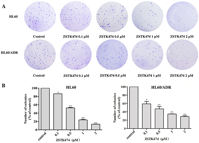 Next, the colony formation assays were conducted to further examine the effects of ZSTK474 on HL60 and HL60/ADR proliferation. The cells were pre-treated with 0, 0.1, 0.5, 1 or 2 μM of ZSTK474 for 48 h and grown in soft agar for 14 days. As indicated in Figure 2A and 2B, the number of the colonies formed by ZSTK474-treated cells was reduced markedly compared with control (without treatment), in either HL60 or the resistant HL60/ADR cells.