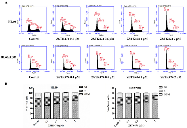 Figure 3: ZSTK474 induced cell cycle arrest at G1 phase in HL60 and HL60/ADR cells. (A) Cell cycle distribution analysis. HL60 and HL60/ADR cells were incubated with indicated concentrations of ZSTK474 for 48 h. The cells were harvested to be available for flow cytometry. (B) The percentages of the cell population in G1, S, and G2/M phases were determined. Data are presented as mean ± SD, representative of three independent experiments.