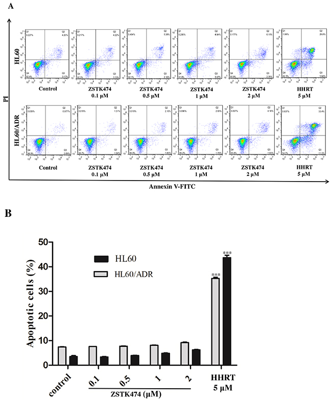 Figure 4: ZSTK474 did not induce obvious apoptosis in HL60 and HL60/ADR cells. (A) HL60 and HL60/ADR cells were incubated with the indicated concentrations of ZSTK474 for 48 h. The cells were harvested, double stained with annexin V and PI, and analyzed with flow cytometry. Homoharringtonine (5 μM) was used as a positive control. (B) The percentage of the apoptotic cell population was determined. Data are presented as mean ± SD, representative of three independent experiments.***: P<0.001, compared with control.