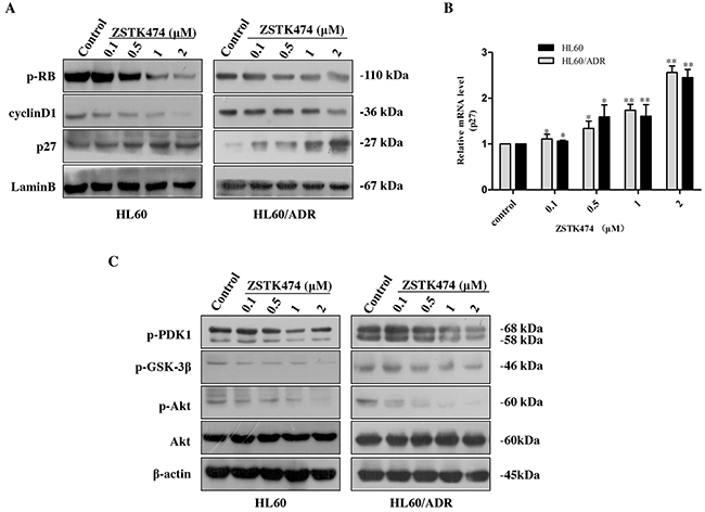 Figure 5: ZSTK474 affected the cell cycle-related molecules. (A) Western blot analysis of cell cycle-related proteins after ZSTK474 treatment. HL60 and HL60/ADR cells were treated with indicated concentrations of ZSTK474 for 48 h. The levels of cyclin D1, p27, and p-pRb in the nuclei were determined. (B) Quantitative RT-PCR analysis of p27 mRNA expression. The relative gene expression levels were quantified by using the comparative Ct (ΔΔCt) method. The results represent mean ± SD of three independent experiments. *: P<0.05, **: P<0.01, ***: P<0.001, compared with control. (C) ZSTK474 inhibited PI3K/Akt pathway in HL60 and HL60/ADR cells. HL60 and HL60/ADR cells were cultured in the presence of various concentrations of ZSTK474 for 48 h. The cells were collected, and the cell lysates were prepared to be available for Western blot analysis of p-PDK1, p-Akt, Akt, p-GSK-3β, and β-actin levels.