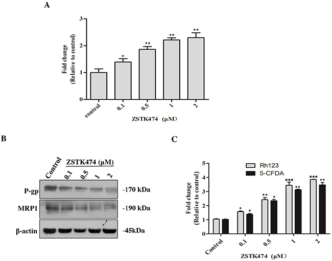 Then we analyzed the effect of ZSTK474 on MDR proteins in HL60/ADR cells. As shown in Figure 6B, the expression of both P-gp and MRP1 protein was decreased in a dose-dependent manner after ZSTK474 treatment. To confirm the effect on the functions of MDR proteins, the intracellular accumulation of P-gp substrate Rh123 and MRP1 substrate 5-CFDA in HL60/ADR cells was determined. As shown in Figure 6C, the accumulation of both Rh123 and 5-CFDA was increased in a dose-dependent manner, as compared with that in the cells without ZSTK474 treatment, further supporting that ZSTK474 might reverse drug resistance by negatively affecting the expression and function of MDR proteins.