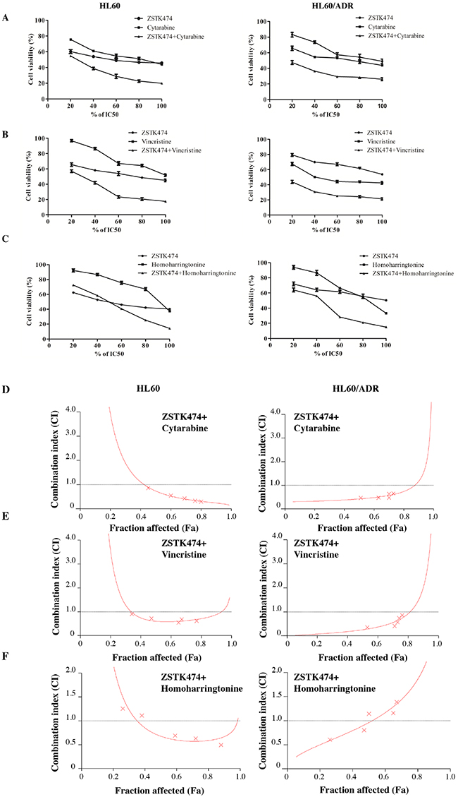 Finally, we investigated the antiproliferative effects of ZSTK474 on HL60 and HL60/ADR cells in combination with various chemotherapeutic drugs. Drug combinations were carried out by adopting a fixed ratio of ZSTK474 to chemotherapeutic drugs (1×IC50 ZSTK474 : 1×IC50 chemotherapeutic drug) and using a series of drug concentrations at this fixed ratio (20%, 40%, 60%, 80% and 100% of the IC50value of each drug). Figure 7A–7C shows that co-treatment with ZSTK474 led to greater inhibition of cell proliferation than each chemotherapeutic drug alone. Combination of ZSTK474 with cytarabine and vincristine exhibited a synergistic effect at all of the tested concentrations with CI<1 (Figure 7D–7E). However, combination with homoharringtonine does not always result in synergistic effect in either HL60 cells or HL60/ADR cells (Figure 7F).