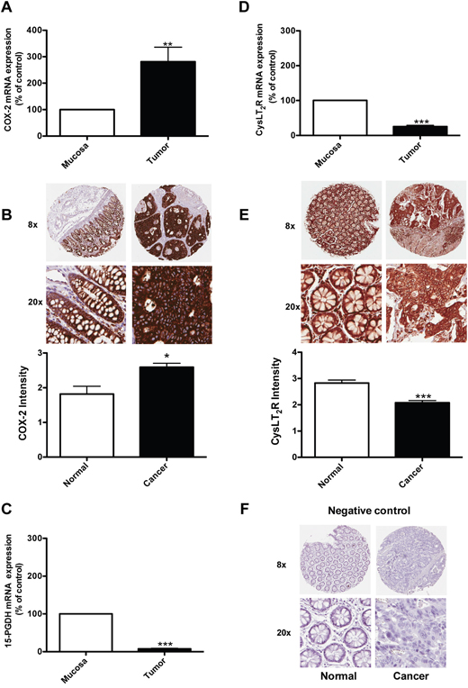 Figure 1: Expression of COX-2, 15-PGDH, and the CysLT2 receptor in colon cancer patients. Quantification of the mRNA expression of (A) COX-2, (C) 15-PGDH, and (D) the CysLT2 receptor from 23 colon cancer patients by qPCR. (B, E) Immunohistochemistry staining with an antibody against the COX-2 ((B), 1:200 dilution) or the CysLT2 receptor ((E), 1:50 dilution); representative protein expression images from colorectal adenocarcinoma tissue and matched normal control tissue from one patient are shown. (F) Showing representative negative control immunohistochemistry staining. The intensity of the CysLT2 staining from all 22 patients was scored and presented in the graph. The data are presented as the percent of control (mucosa) and represent the mean ± standard error of mean (SEM). Statistical analysis was performed using an unpaired t-test; *P≤0.05, **P<0.01, ***P<0.001.