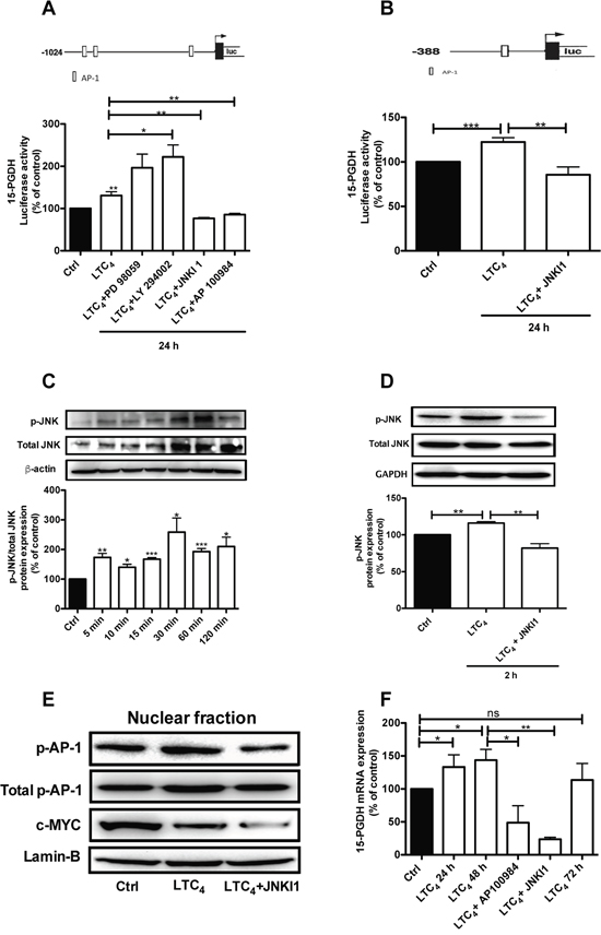 Figure 3: LTC4 induced 15-PGDH promoter activity in HT-29 cells. (A) Schematic cartoon of both 15-PGDH promoters showing the different potential binding sites for the transcription factor AP-1 and the luciferase activity of 15-PGDH in cells seeded onto 12-well plates, transfected with the 15-PGDH promoter construct (-1024 bp) for 24 h, and subsequently pretreated with or without 50 μM PD 98059, 50 μM LY294002, or 10 μM JNK inhibitor I for 30 min prior to stimulation with 40 nM LTC4 for 24 h. (B) The cells were transfected with a 15-PGDH promoter construct (-388 bp) and pretreated with or without 10 μM JNK inhibitor I for 30 min prior to stimulation with 40 nM LTC4. (C) Western blot and densitometric analyses of LTC4-induced JNK phosphorylation in HT-29 cells at the indicated time-points. (D) The cells were treated with JNK inhibitor I 30 min prior to stimulation with or without 40 nM LTC4 for 2 h and then lysed, and the lysates were subjected to SDS-PAGE and immunoblotting with an antibody against p-JNK. The membrane was re-probed with an antibody against total JNK (both the p-JNK and total JNK antibodies were diluted 1:1000) and subsequently incubated with an antibody against GAPDH to ensure equal loading. (E) Western blot analyses of nuclear fractions of HT-29 cells incubated with JNK inhibitor I 30 min prior to stimulation or not with LTC4; the blots show phosphorylated AP-1 (AP-1; re-probed for total AP-1/Jun; both diluted 1:1000) and c-MYC (1:1000) and were re-probed for Lamin-B expression to ensure equal loading. (F) Analysis of the effect of LTC4 on 15-PGDH mRNA expression in HT-29 cells pretreated with or without the CysLT2 antagonist AP100984 or JNK inhibitor I. The data are presented as the percent of untreated control cells and represent the mean ± SEM of at least three separate experiments. Statistical analysis was conducted using an unpaired t-test and ANOVA; *P≤0.05, **P<0.01, ***P<0.001.