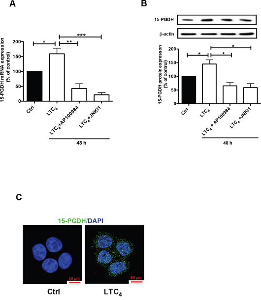 To confirm these results, we also investigated the effect of LTC4 on 15-PGDH expression in an additional colon cancer cell line, Caco-2. Similar to its effect in HT-29 cells, LTC4 could also induce the expression of 15-PGDH in Caco-2 cells, and this induction could be inhibited by AP100984 and JNK inhibitor I at both the mRNA (Figure 4A) and protein (Figure 4B) levels. We also confirmed that LTC4 induced the expression of 15-PGDH in Caco-2 cells using confocal microscopy (Figure 4C).