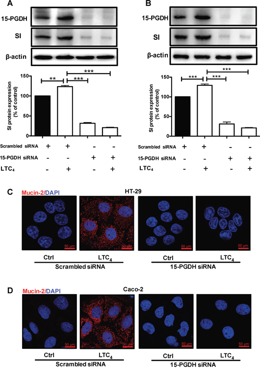Figure 6: Effect of 15-PGDH down-regulation on the cell differentiation markers SI and Mucin-2. (A) A representative western blot and densitometric analysis of LTC4-induced SI protein expression after transfection with a scrambled control siRNA or 15-PGDH siRNA in HT-29 cells are shown. The cells were treated with or without 40 nM LTC4 for 48 h, and the change in the SI protein level was detected using an SI-specific antibody (1:1000 dilution) and 15-PGDH was detected using a 15-PGDH antibody (1:5000 dilution). The membrane was re-probed with an antibody against β–actin to ensure equal loading. (B) A representative western blot and densitometric analysis performed as in (A) shown here for Caco-2 cells. (C, D) Representative confocal microscopy immunofluorescence images from cells transfected with a scrambled control siRNA or 15-PGDH siRNA with or without stimulation with 40 nM LTC4 for 48 h. The expression of Mucin-2 (in red; antibody dilution, 1:500; DAPI in blue, dilution 1:1000) (C) in HT-29 cells and (D) Caco-2 cells is shown. The objective used was 63x, and the scale bar is 50 μm. The data are presented as the percent of control cells and represent the mean ± SEM of at least three separate experiments. Statistical analysis was conducted using an unpaired t-test; *P≤0.05, **P<0.01.