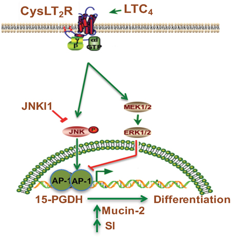 In conclusion, we provide the first evidence that LTC4, via CysLT2 signaling, can induce 15-PGDH expression through the activation of the JNK/AP-1 pathway (see Figure 7). This activation in turn induces the differentiation of colon cancer cells, while 15-PGDH down-regulation totally abolished the LTC4-induced increase in the expression of the differentiation markers Mucin-2 and SI. These data support the previous finding that the CysLT2 receptor might have an anti-tumorigenic effect in colon cancer.