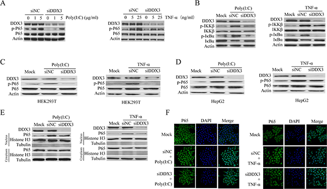 It is well-known that cytokine production can be regulated by the NF-κB signal pathway [66]. Meanwhile, both poly(I:C) and TNF-a could activate NF-κB signal pathway. Therefore, we speculated that DDX3 might regulate inflammatory cytokine production through NF-κB. We first tested whether DDX3 knockdown affected the phosphorylation of p65, the critical process for NF-κB pathway activation. Western blot analysis showed that the phosphorylation of p65 in HeLa cells stimulated by poly(I:C) or TNF-α was decreased after DDX3 expression was knocked down (Figure 2A). The same results were also observed in HEK-293T (human embryonic kidney cell line) (Figure 2C) and HepG2 cells (human liver cancer cell line) (Figure 2D).