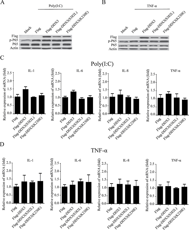 Figure 3: The ATPase and helicase activities of DDX3 do not influence NF-κB signal pathway. HeLa cells were first transfected with the plasmids: Flag, Flag-DDX3, Flag-DDX3(S382L), Flag-DDX3(K230E) for 48 hours then were stimulated with poly(I:C) or TNF-α for another 6 hours. The phosphorylation of p65 was detected by western blot (A, B) and the relative expression of IL-1, IL-6, IL-8, TNF-α mRNA was assessed by qRT-PCR(C, D). Data are representative of at least two independent experiments.