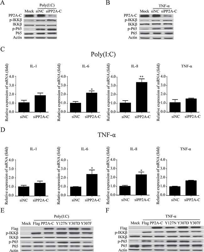 Figure 5: PP2A-C regulates the NF-κB signal pathway. The PP2A-C expression was silenced with siPP2A-C in HeLa cells. The cells were transfected with poly(I:C)(5 μg/ml) or stimulated with TNF-α(25 ng/ml) for 6 hours. The phosphorylation of IKK-β and p65 were detected by western blot (A, B) and the relative mRNA levels of IL-1, IL-6, IL-8, TNF-α were assessed by qRT-PCR (C, D). The scrambled siRNAs (siNC) were used as the control. The differences between means were considered significant at *p < 0.05, very significant **p < 0.01. HeLa cells were transfected with the wild type PP2A-C and its mutants (Y127N, Y307D, or Y307F) for 48 hours, followed by poly(I:C)(5 μg/ml) transfection or TNF-α (25 ng/ml) stimulation for 6 hours. The phosphorylation of IKK-β and p65 were detected by western blot (E, F).