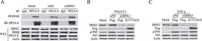 Figure 6: DDX3 regulates the interaction between IKK-β and PP2A-C. HeLa cells were first transfected with siRNA (siNC or siDDX3) for 48 hours. The interaction between endogenous IKK-β and PP2A-C in HeLa cells was analyzed by the immunoprecipitation with anti-PP2A-C or rabbit IgG. The whole-cell lysates (WCL) were also analyzed by immunoblot with the anti-DDX3, anti-IKK-β, anti-PP2A-C or anti-actin antibody (A). DDX3 expression was first silenced before cells were transfected with the plasmids: Flag and Flag-IKK-β (S177/181E) for 48 hours. The cells were then transfected with poly(I:C)(5 μg/ml) (B) or stimulated TNF-α(25 ng/ml) (C) for 6 hours. The phosphorylation of p65 was detected by western blot.