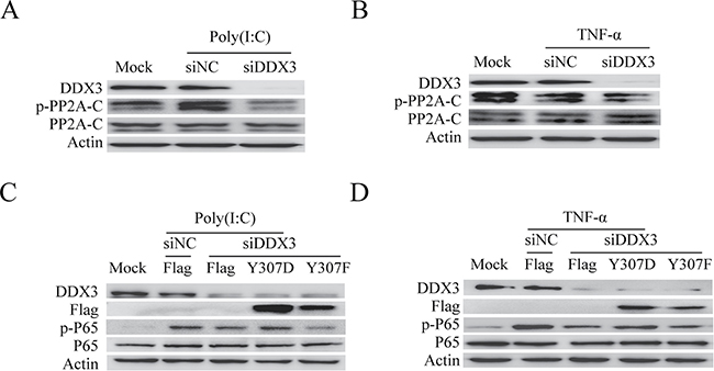 Figure 7: DDX3 controls the phosphorylation of PP2A-C. DDX3 expression was silenced before the phosphorylation of PP2A-C was tested by western blot after the cells were either transfected with poly(I:C)(5 μg/ml) (A) or stimulated with TNF-α (25 ng/ml) (B) for 6 hours. DDX3 expression was first silenced before cells were transfected with the plasmids: Flag, Flag-PP2A-C(Y307D) and Flag-PP2A-C(Y307F) for 48 hours. The cells were then transfected with poly(I:C)(5 μg/ml) (C) or stimulated TNF-α(25 ng/ml) (D) for 6 hours. The phosphorylation of p65 was detected by western blot.