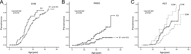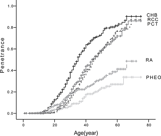 In this retrospective cohort study, we included all the VHL patients diagnosed at Peking University First Hospital (Beijing, China) prior to June 1 2016. A total of 291 patients from 115 different families were included for analysis. Individuals were diagnosed as patients with VHL if they carried a VHL germline mutation (n = 198) and/or fulfilled the clinical VHL criteria (n = 255) [4, 6, 19]. VHL mutation confirmation was verified in at least one patient of each family. The VHL status of family members who had not been verified by genetic testing was based on clinical criteria as obtained through interviews with patients, family members and medical record review. Of the included patients, 90.7% (264 of 291) harbored at least one VHL manifestation while the rest were asymptomatic mutation carriers. Follow up was determined from the time of first clinical presentation confirmed on imaging for symptomatic patients or the time of genetic diagnosis of VHL for asymptomatic mutation carriers to death or June 1 2016. Medical charts, radiographic and histological records on all affected individuals and on asymptomatic individuals who were proven VHL mutation carriers were subsequently reviewed to determine age at first diagnosis of the five major VHL lesions: CHB, RA, RCC (RCC or combined RCC and renal cysts), PCT (pancreatic cysts or combined cysts and tumors), and PHEO.