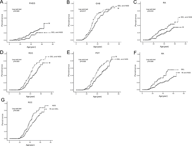 We compared the age-related risks and mean diagnostic ages of the five major VHL lesions in patients with different mutation types (Table 1, Figure 3). M mutations conferred an increased risk of PHEOs (Figure 3A), but a decreased risk of CHBs, RAs, RCCs and PCTs as compared to DEL and NSS mutations (Figure 3B–3E). DEL mutations were more prone to developing RAs than M and NSS mutations (Figure 3F). RCCs were more frequent in the setting of NSS mutations compared to M and DEL mutations (Figure 3G). The mean diagnostic age of CHBs was significantly earlier in patients with DEL and NSS mutations than in patients with M mutations.