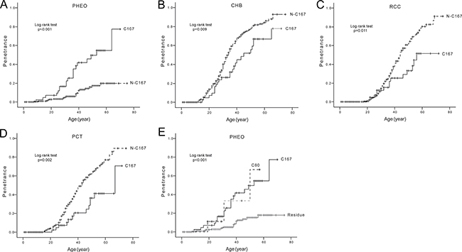 Codon 167 was the most frequently mutated codon of VHL gene in our study. We compared the age-related risks and mean diagnostic ages of the five major VHL lesions in patients with mutations at codon 167 (C167 group) and patients with other mutations (N-C167 group). The results are summarized in Table 3 and Figure 5. C167 mutations conferred a significantly higher risk of PHEOs development, but a lower risk of CHBs, RCCs and PCTs compared to the N-C167 group (Figure 5A–5D). The risks of RAs in the two groups were similar.