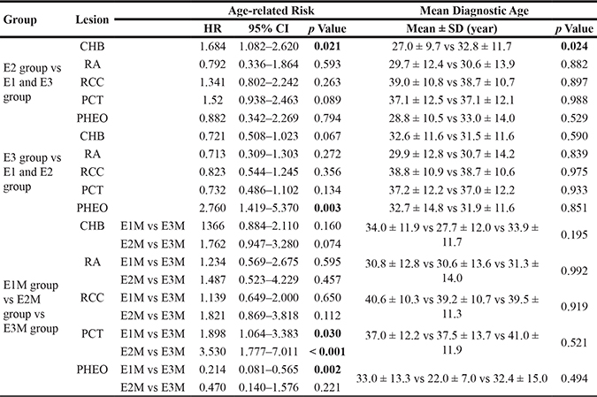 Table 1: Comparison of the age-related risks and mean diagnostic ages of the five major VHL lesions in patients with different mutation types