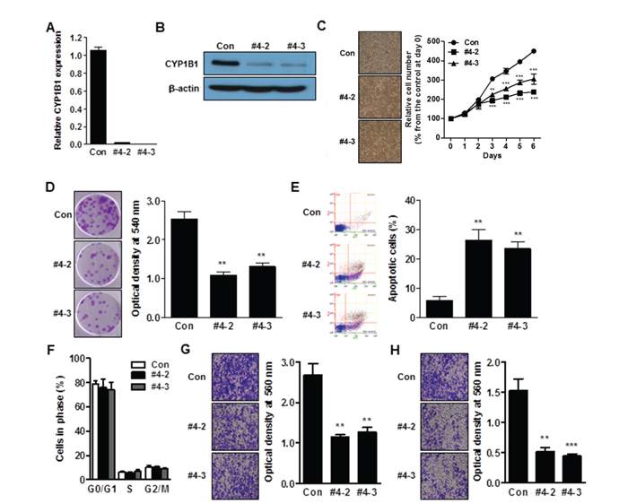 Since CYP1B1 is up-regulated in PCa cells, we used a CYP1B1 knockdown approach with lentivirus-mediated shRNA targeting CYP1B1 to explore its biological significance. To this end, we generated CYP1B1 deficient PC-3 and DU145 cells. Among the 4 shRNA candidates, the CYP1B1 shRNA #4 construct in PC-3 cells and #2 construct in DU145 cells exhibited the best efficiency by transient transfection and were used for establishing stable cell lines (Supplementary Figure 1). Subclones were produced from stably transfected CYP1B1 shRNAs and the resultant knockdown cell lines, PC-3/CYP1B1 shRNA #4-2 and #4-3, and DU145/CYP1B1 shRNA #2-12 and #2-23, were selected for the further functional studies (Figure 2A and 2B; Supplementary Figure 2A and 2B). No difference in cell growth and morphology was observed during first and the 2 days of cell growth but cell proliferation was significantly decreased starting 3 days after seeding of both CYP1B1 knockdown cell lines (Figure 2C and Supplementary Figure 2C). Clonogenic assays also confirmed the impact of CYP1B1 inhibition on delayed growth of cells (Figure 2D and Supplementary Figure 2D). To further understand the growth-inhibitory effect of CYP1B1 reduction, we assessed apoptosis and cell cycle distribution by flow cytometric analysis. The apoptotic cell fractions were significantly increased in CYP1B1 knockdown cells (Figure 2E and Supplementary Figure 2E). However, no significant change in cell cycle progression was observed (Figure 2F and Supplementary Figure 2F). We did observe that CYP1B1 inhibition results in lower motility and invasiveness of PCa cells (Figure 2G and 2H; Supplementary Figure 2G and 2H). These results suggest that CYP1B1 plays a role as an oncogene in PCa and its targeted inhibition could suppress tumorigenesis.