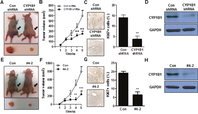 Figure 3: CYP1B1 inhibition suppresses in vivo tumor growth. (A to D) Effect of intratumoral injection of CYP1B1 shRNA on in vivo tumor growth. Volume of tumor established by PC-3 cells after administration of shRNAs for CYP1B1 or control. Representative image of tumors grown in mice and tumors extracted from individual mice (A) and quantification of tumor volume (B). Quantification of Ki67-positive cells in the control or CYP1B1 shRNA injected tumors. Representative image of section (left panel) and quantification of stained cells (right panel) are shown. Total 20 fields/sample were counted (C). CYP1B1 protein expression in tumors injected with control or CYP1B1 shRNA (D). (E–H) Effect of CYP1B1 shRNA knockdown on in vivo tumor growth using xenograft mouse model. Volume of tumor established by PC-3 cells stably expressing CYP1B1 shRNA #4-2 in xenografts. Representative image of tumors grown in mice and tumors extracted from individual mice (E) and quantification of tumor volume (F). Quantification of Ki67-positive cells in the control or CYP1B1 shRNA #4-2 expressing xenograft tumors. Representative image of section (left panel) and quantification of stained cells (right panel) are shown. Total 20 fields/sample were counted (G). CYP1B1 protein expression of control or CYP1B1 shRNA #4-2 expressing xenograft tumors (H). *p<0.05; **p<0.01; ***p<0.001.