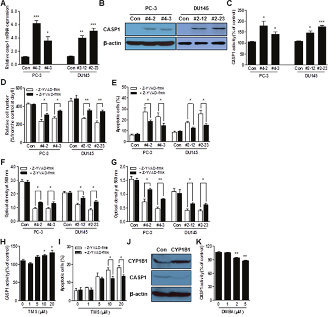 Figure 4: CASP1 is a functional target of CYP1B1. (A–C) CASP1 mRNA (A), protein (B), and enzyme activity (C) in CYP1B1 shRNA stably expressing PCa cells. Levels were determined by qRT-PCR, Western blot and colorimetric assay, respectively. (D–G) Effect of CASP1 inhibition on the tumorigenicity of CYP1B1 shRNA stably expressing PCa cells. Cells were treated with Z-YVAD-fmk (100 μM) and proliferation (D), apoptotic cell death (E), migration (F), as well as invasion (G) were examined, respectively. (H) Effect of chemical inhibition of CYP1B1 on CASP1 activation. CASP1 activity was determined by colorimetric assay in PC-3 cells treated with the indicated concentration of TMS. (I) Effect of CASP1 inhibition on apoptotic cell death induced by chemical inhibition of CYP1B1. Apoptotic cell death was determined by flow cytometric analysis using double staining with Annexin V-FITC and 7-AAD in TMS-treated PC-3 cells with or without addition of Z-YVAD-fmk (100 μM). (J and K) Effect of CYP1B1 activation on CASP1 in RWPE-1 cells. CASP1 expression was determined by Western blot after CYP1B1 overexpression (J). CASP1 activity was examined by colorimetric assay in cells treated with the indicated concentration of DMBA (K). *p<0.05; **p<0.01; ***p<0.001.