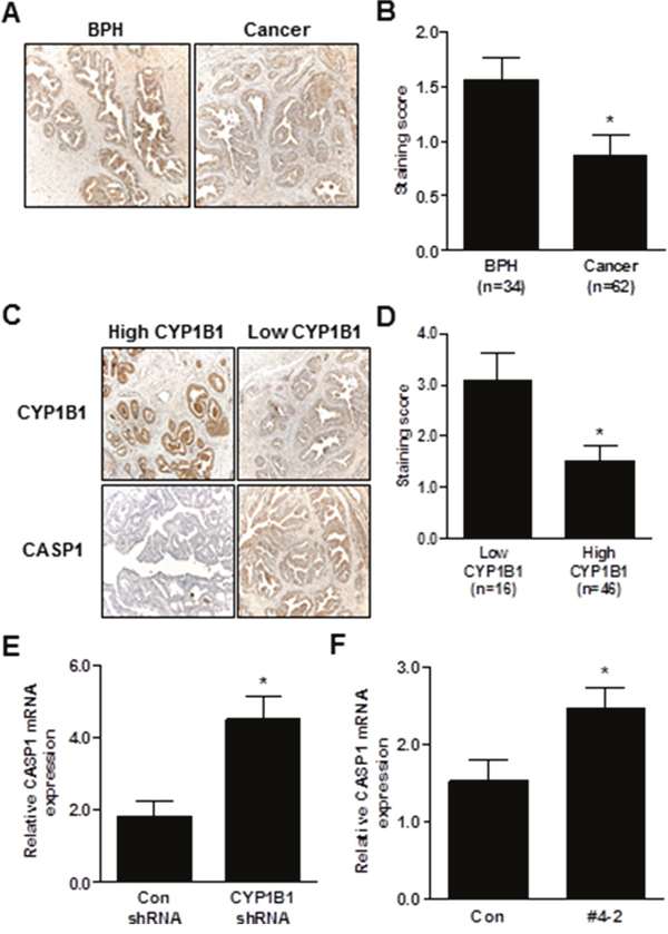 Figure 6: Inverse correlation between CYP1B1 and CASP1 expression. (A and B) Immunohistochemical staining of CASP1 protein in PCa specimens. Representative images showing immunoreactive caspase-1 in BPH and cancer tissues (magnification: × 200) (A). Summary of CASP1 immunostaining score (B). (C and D) Immunohistochemical staining of CYP1B1 and CASP1 protein in prostate cancer specimens. Representative images showing inverse correlation of CYP1B1 and CASP1 in BPH and cancer tissues (magnification: × 200) (C). Summary of CASP1 immunostaining score (D). (E and F) Expression of CASP1 mRNA in tumors injected with CYP1B1 shRNA (E) and PC-3/CYP1B1 shRNA #4-2 xenografts (F). *p<0.05.
